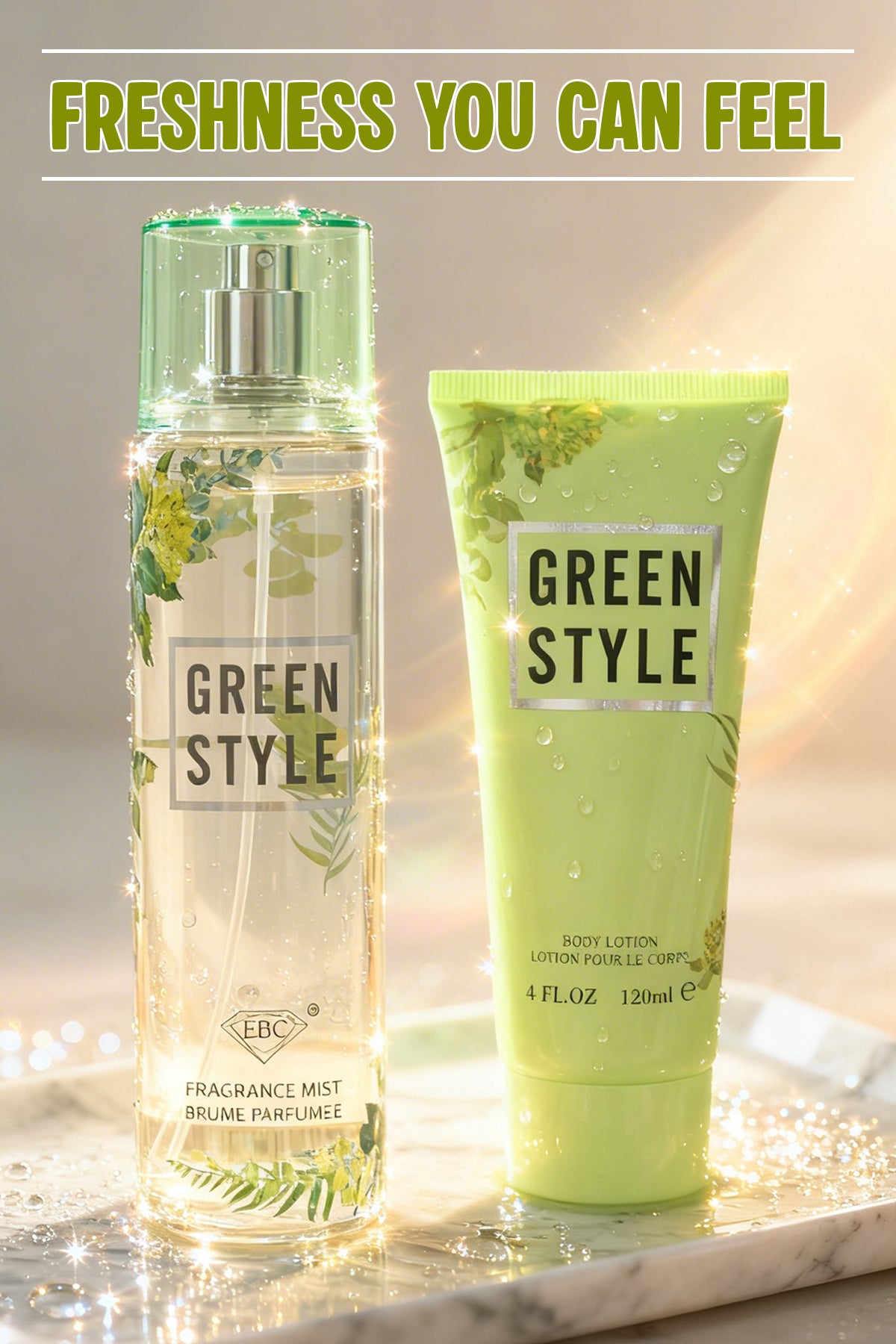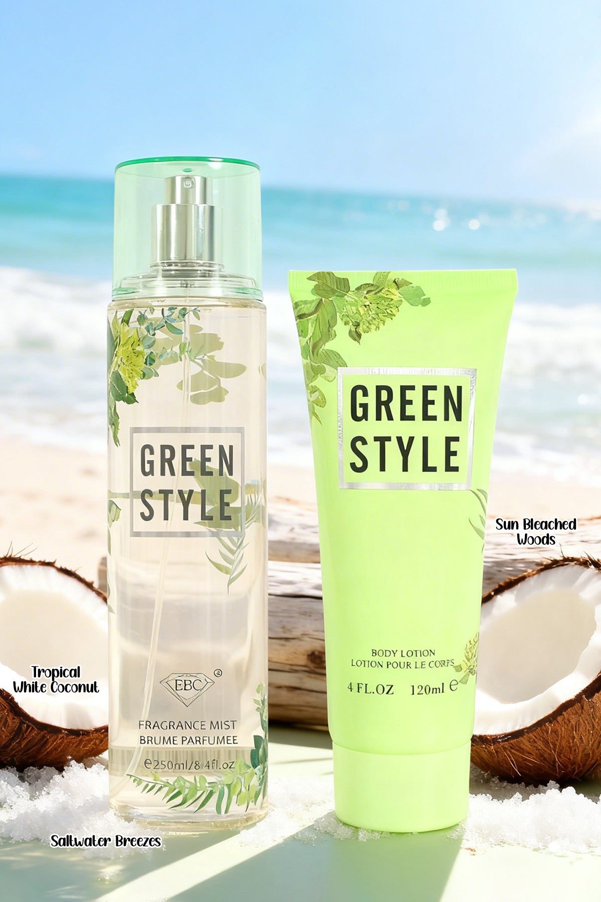 Escape to paradise with Green Style (SET). Experience a refreshing blend of tropical white coconut, invigorating saltwater breezes, and warm, sun-bleached woods. Your perfect fresh scent awaits.