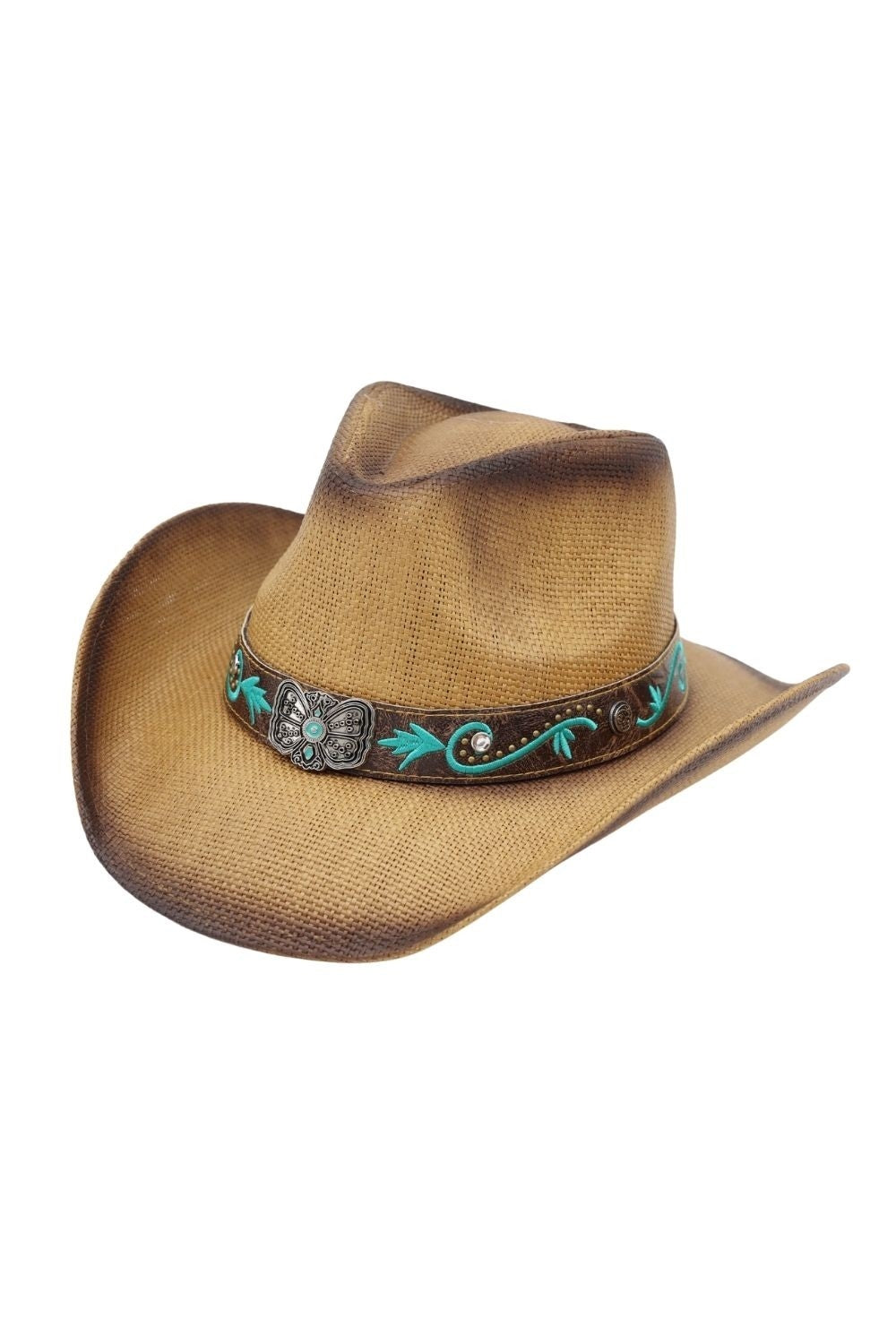 DISTRESSED STRAW HAT WITH TURQUOISE BLOOM & BUTTERFLY CONCHO BAND