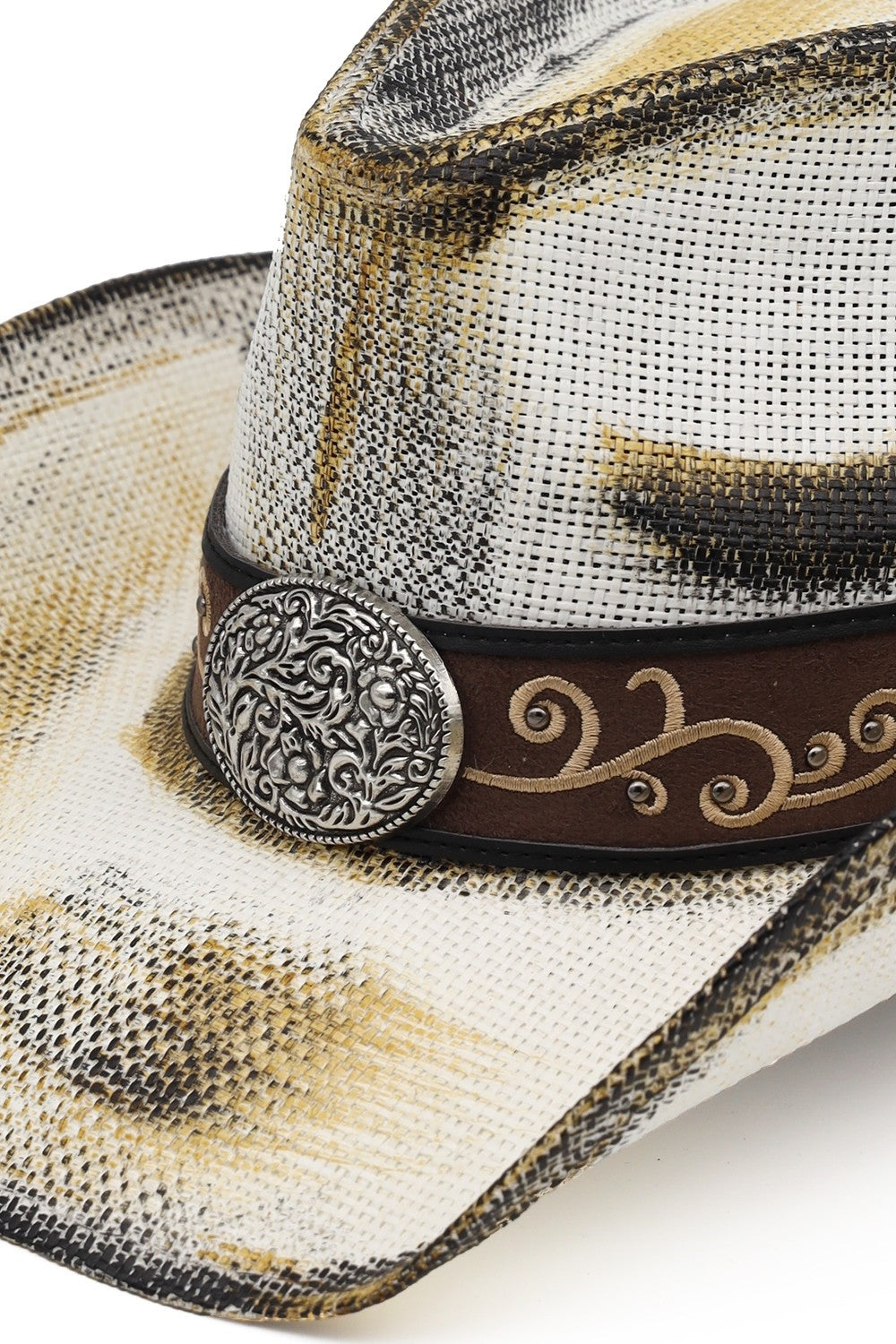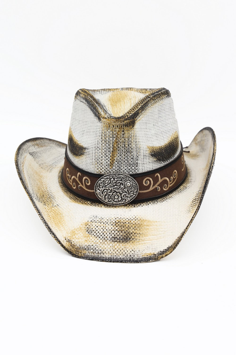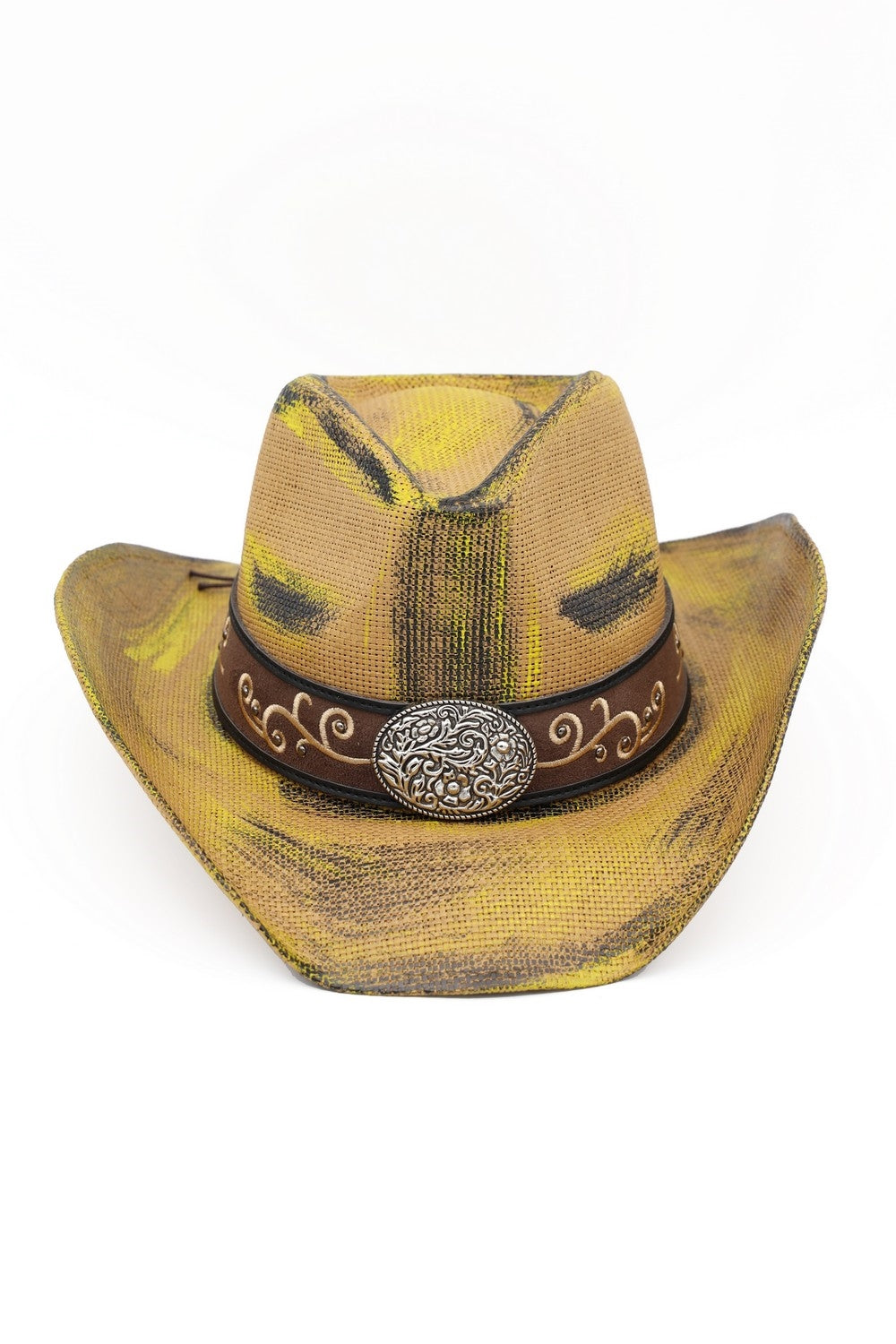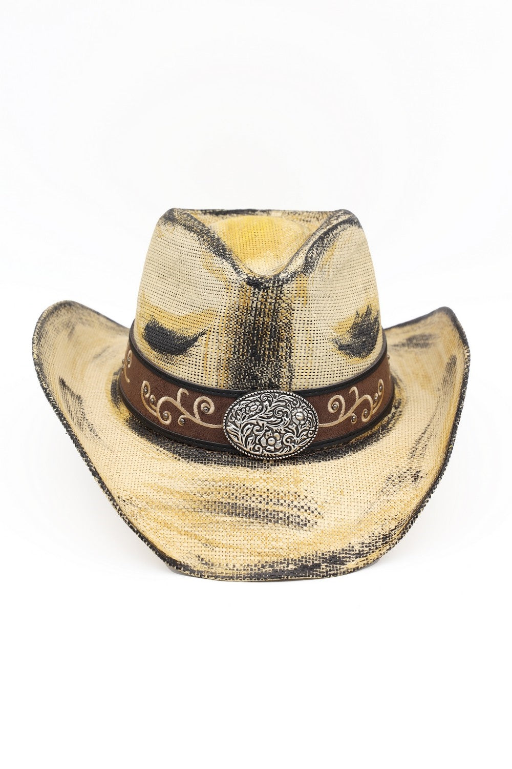 ANTIQUE WASH STRAW COWBOY HAT WITH ORNATE OVAL BUCKLE FAUX LEATHER BAND