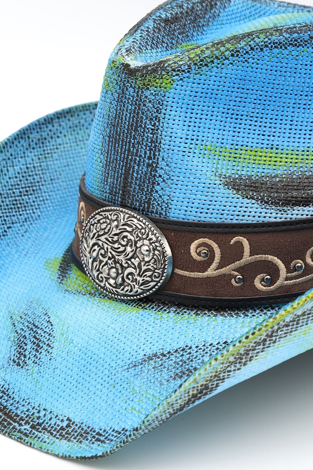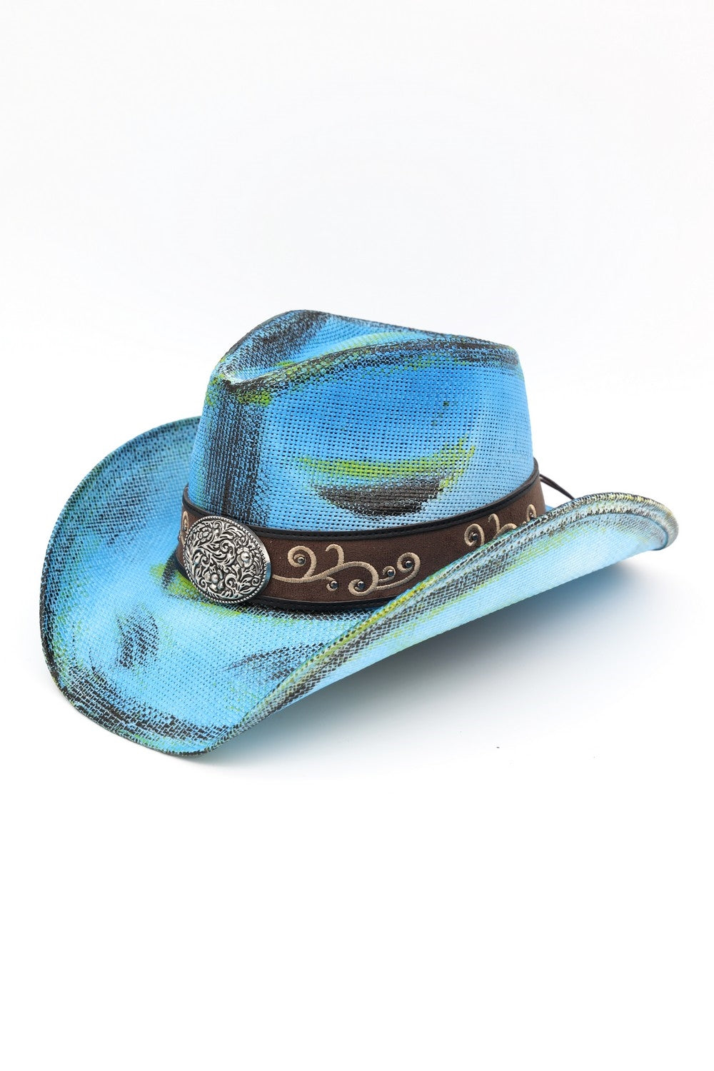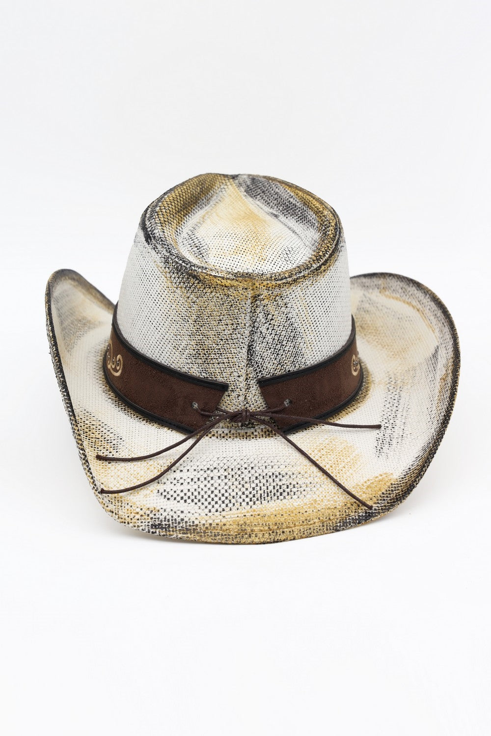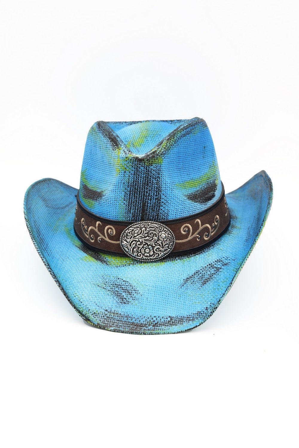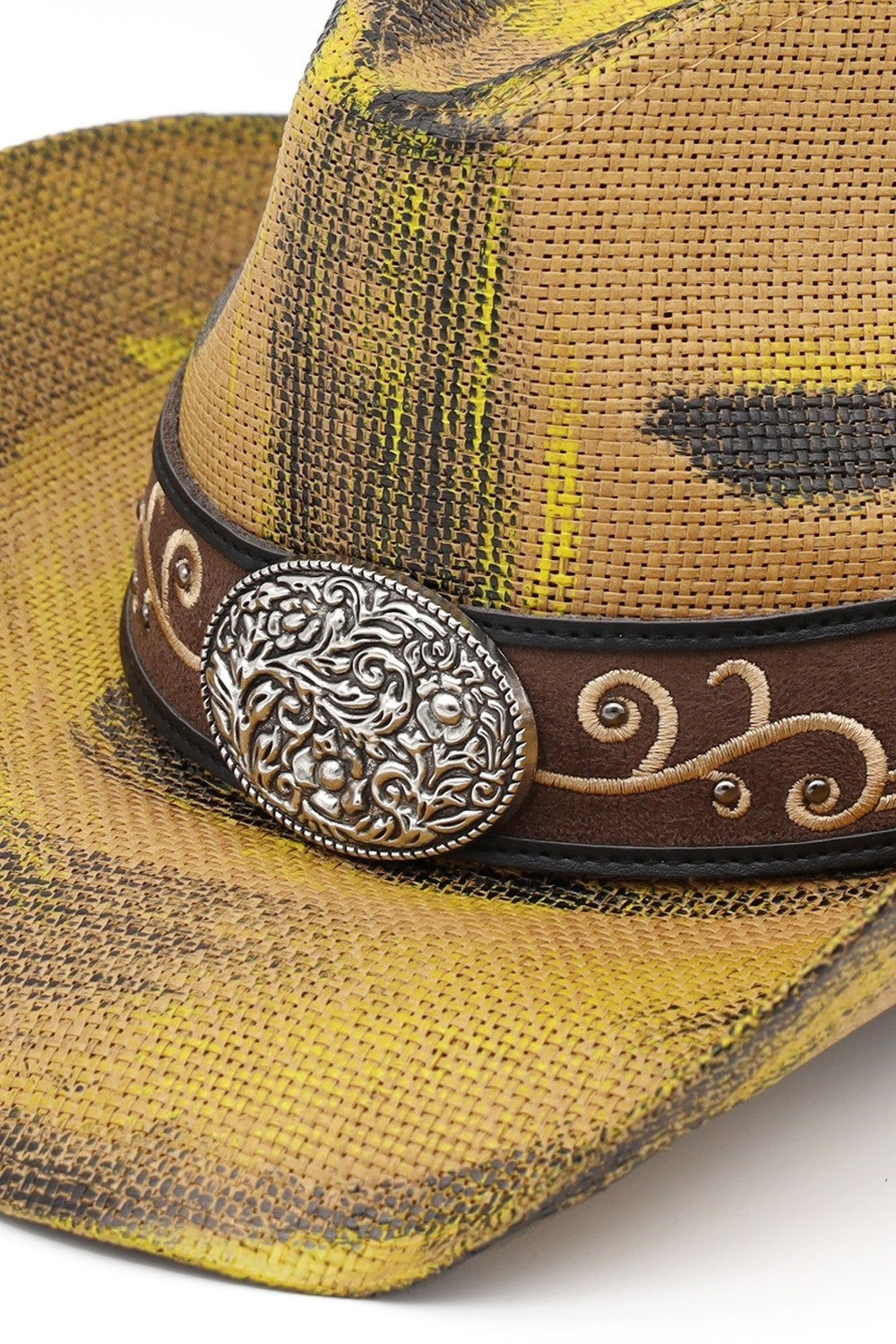 ANTIQUE WASH STRAW COWBOY HAT WITH ORNATE OVAL BUCKLE FAUX LEATHER BAND