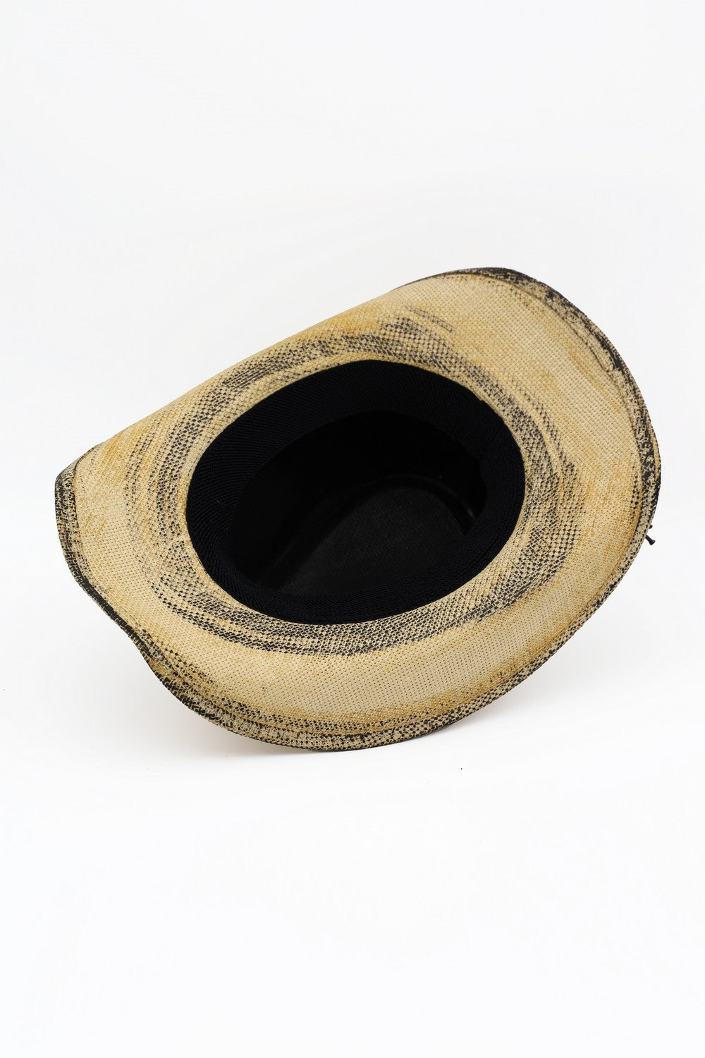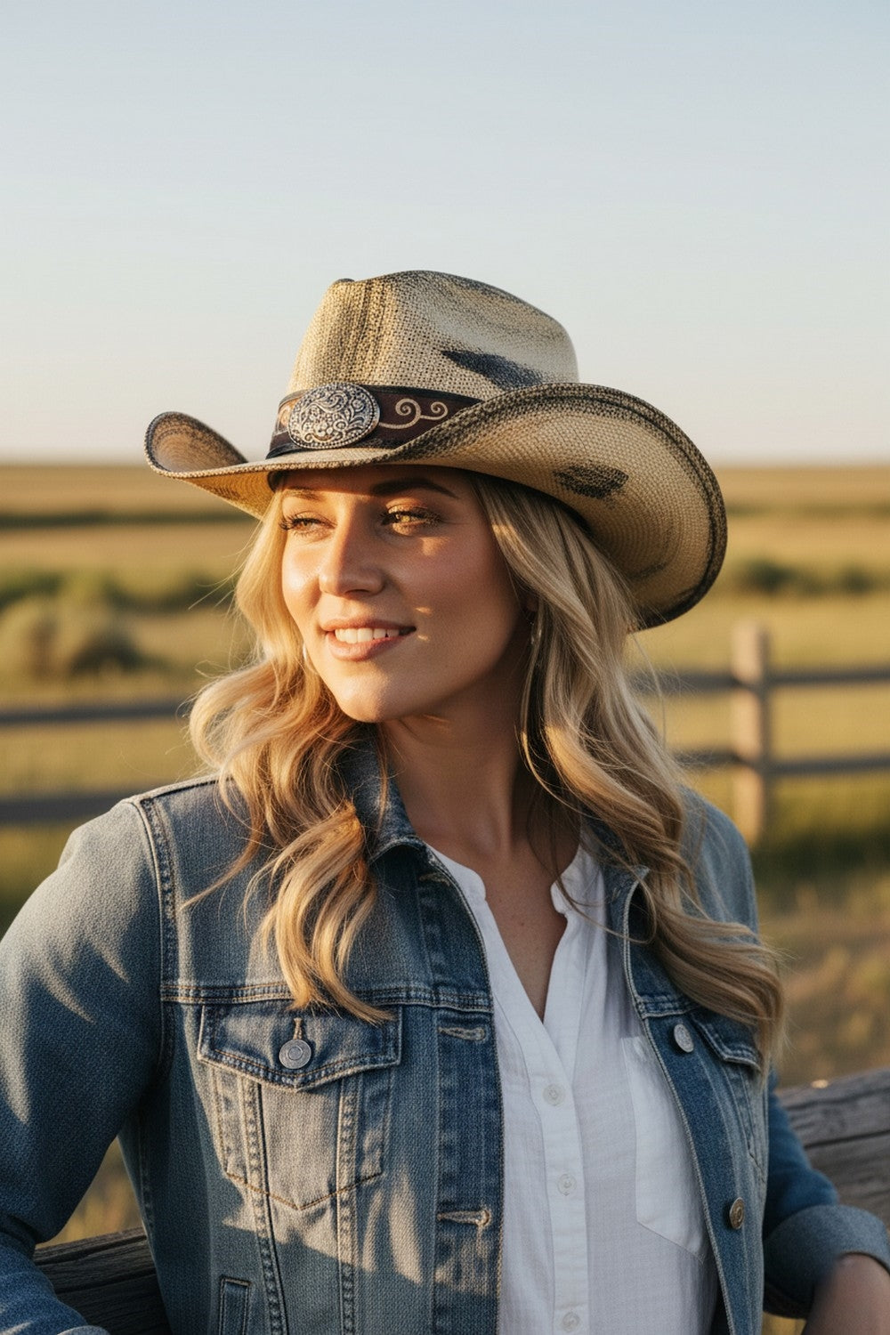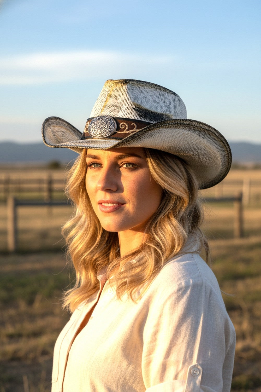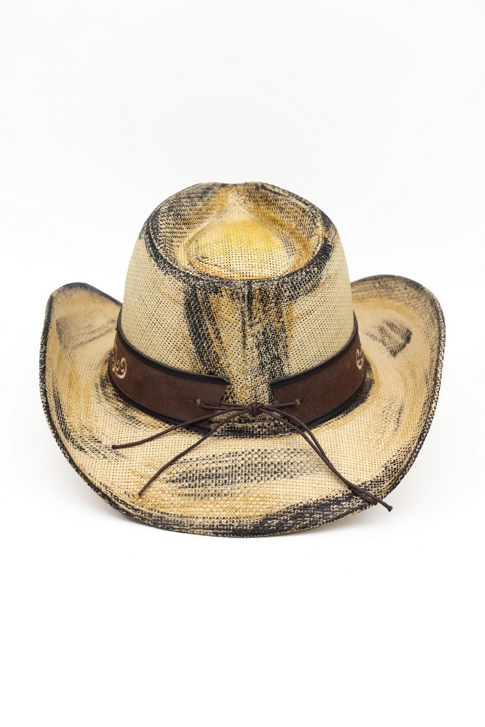 ANTIQUE WASH STRAW COWBOY HAT WITH ORNATE OVAL BUCKLE FAUX LEATHER BAND