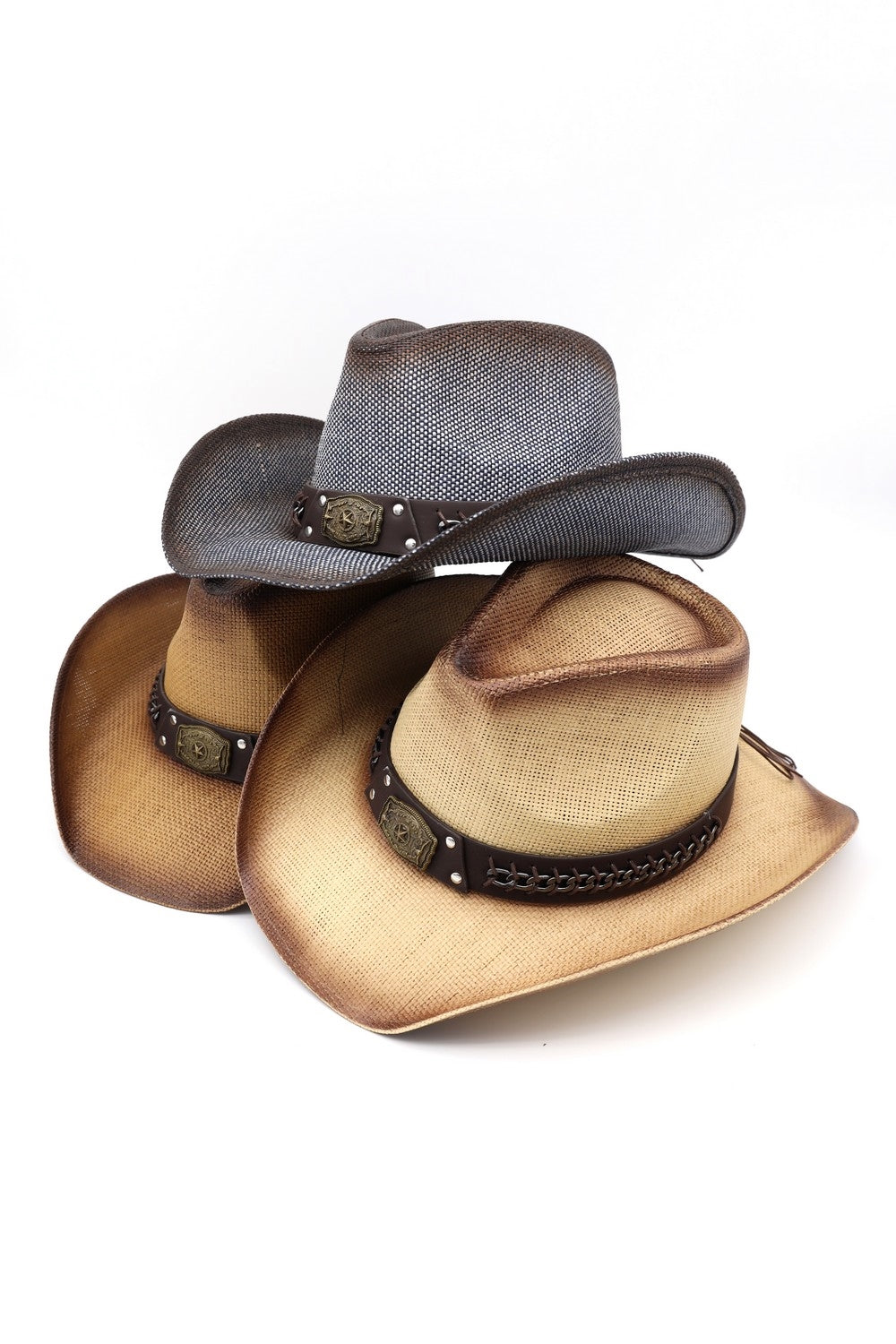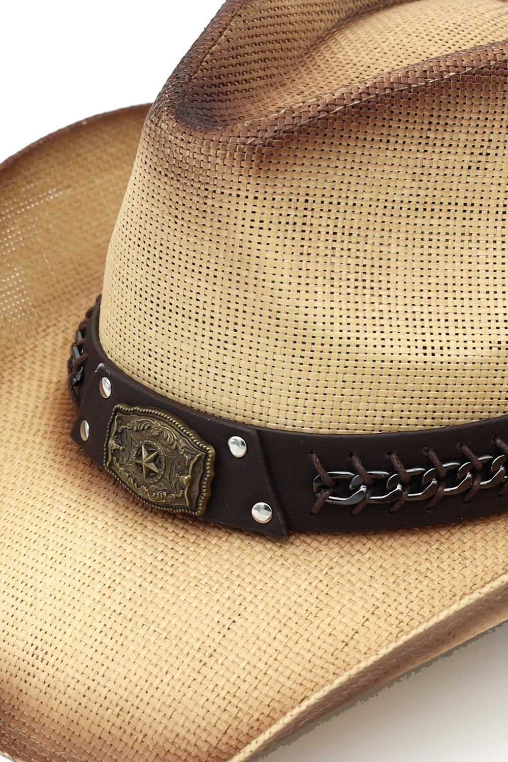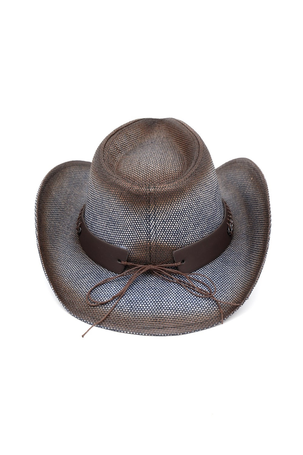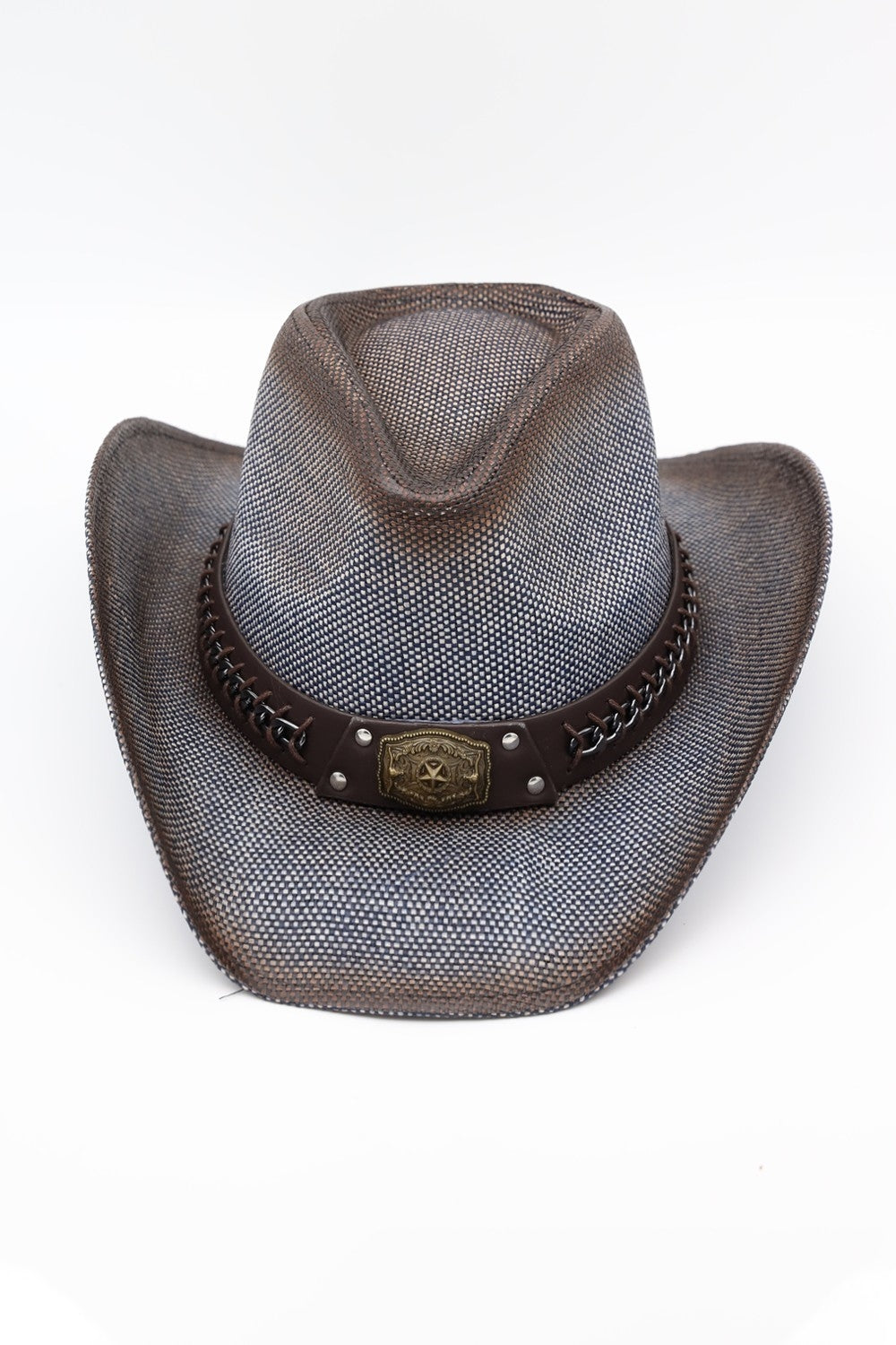 RUSTIC COWBOY HAT WITH CHAIN AND CONCHO DETAIL FAUX LEATHER BAND