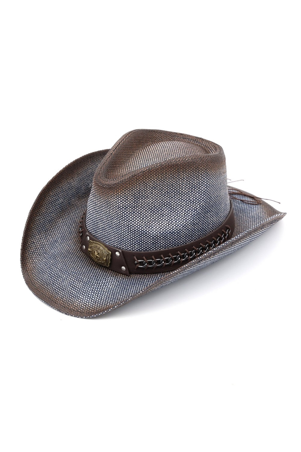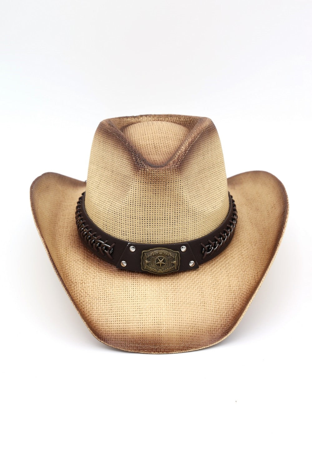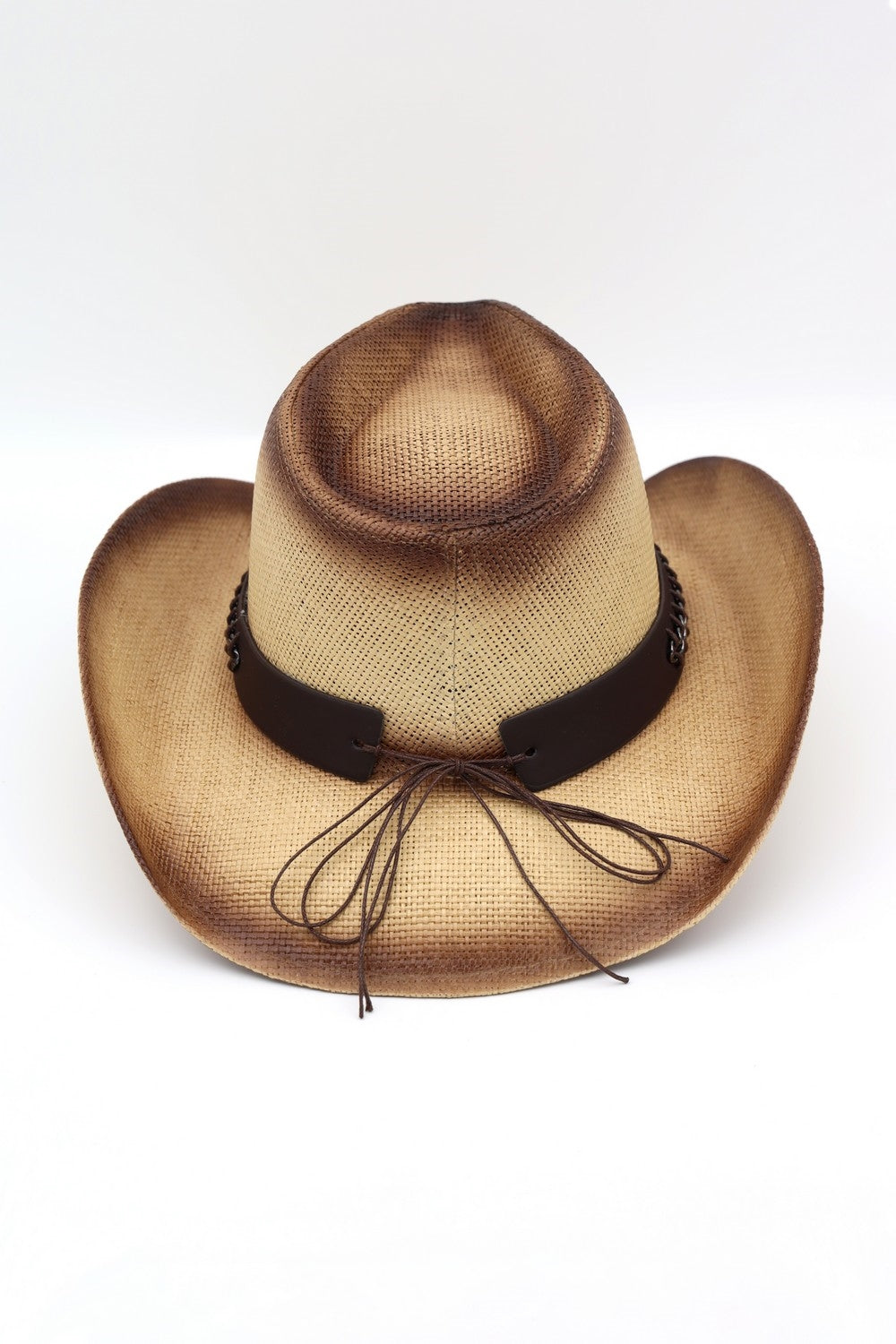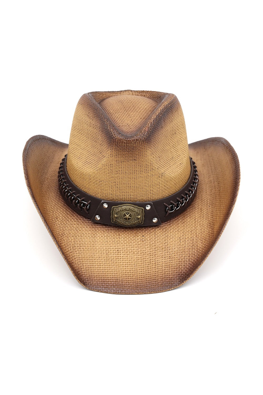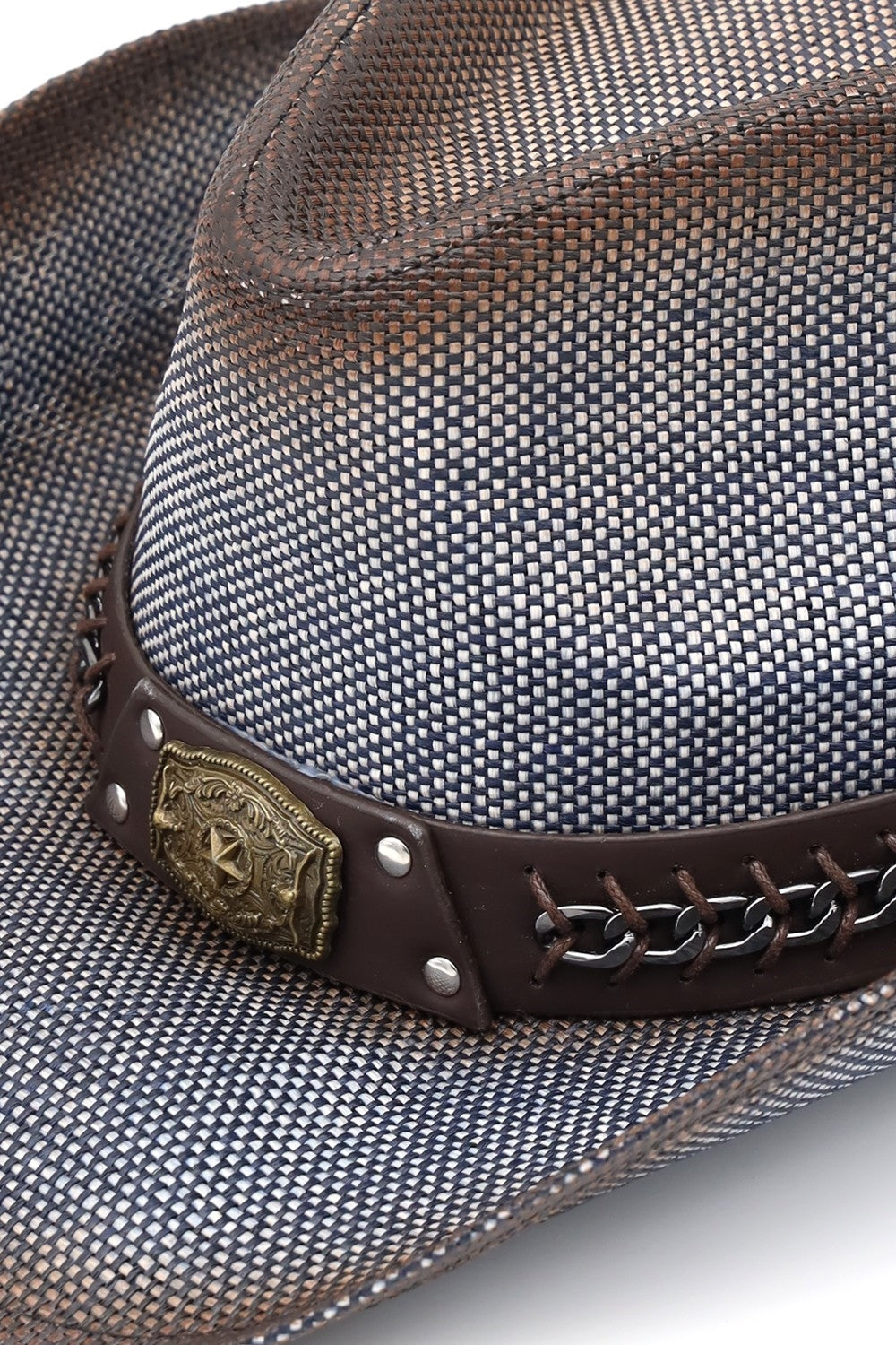 RUSTIC COWBOY HAT WITH CHAIN AND CONCHO DETAIL FAUX LEATHER BAND