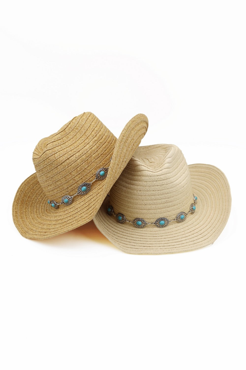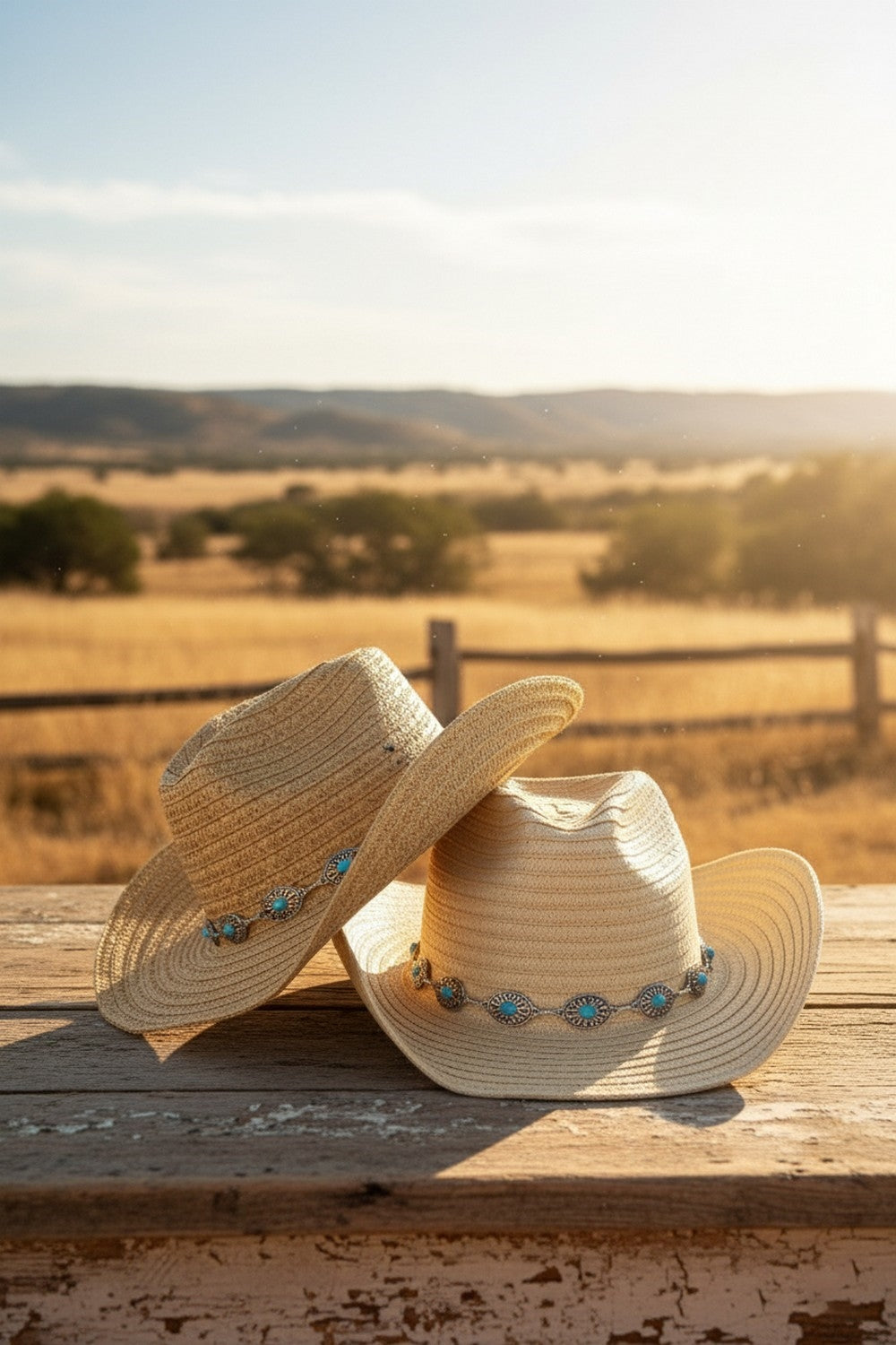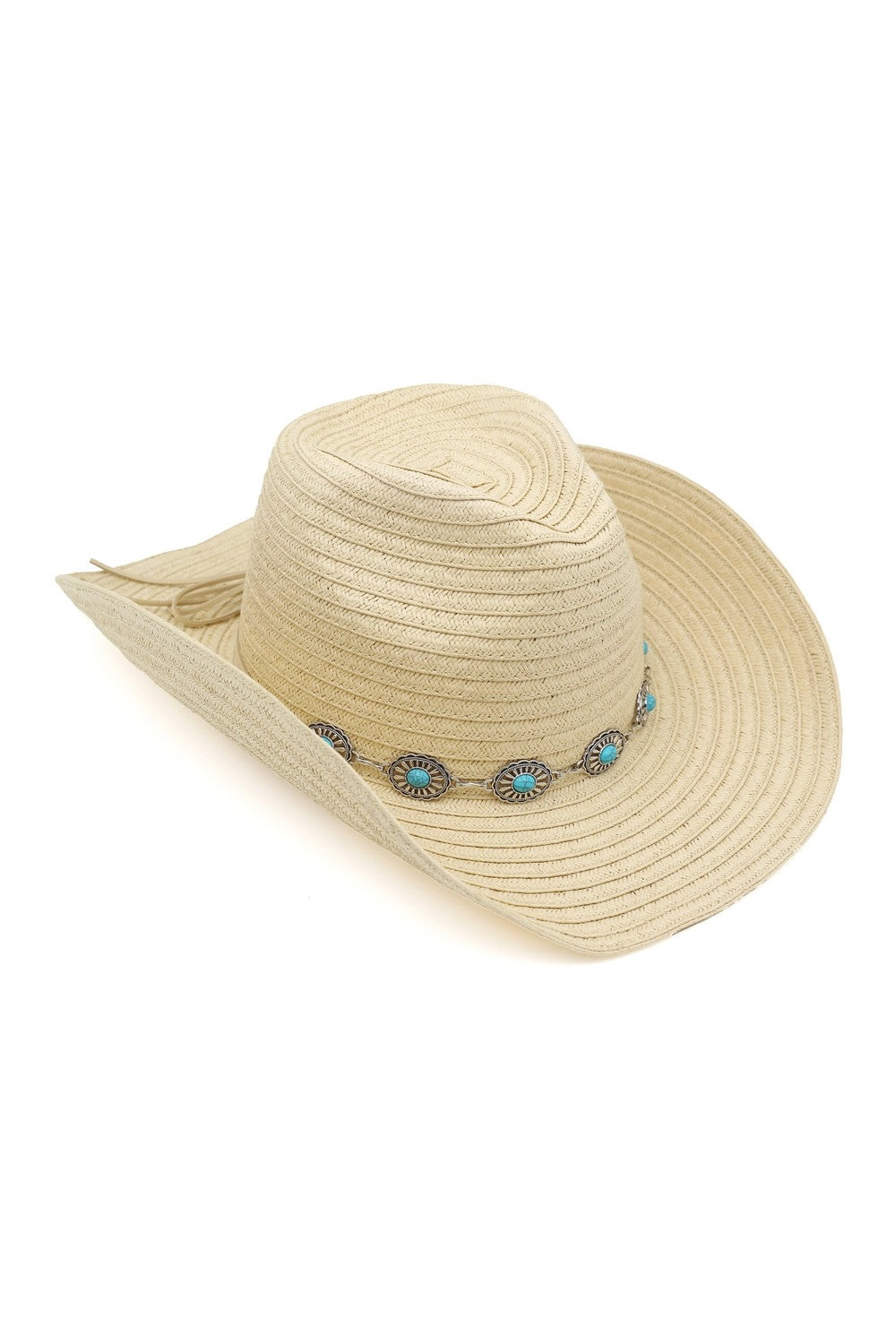 STRAW COWBOY HAT WITH TURQUOISE CONCHO BAND