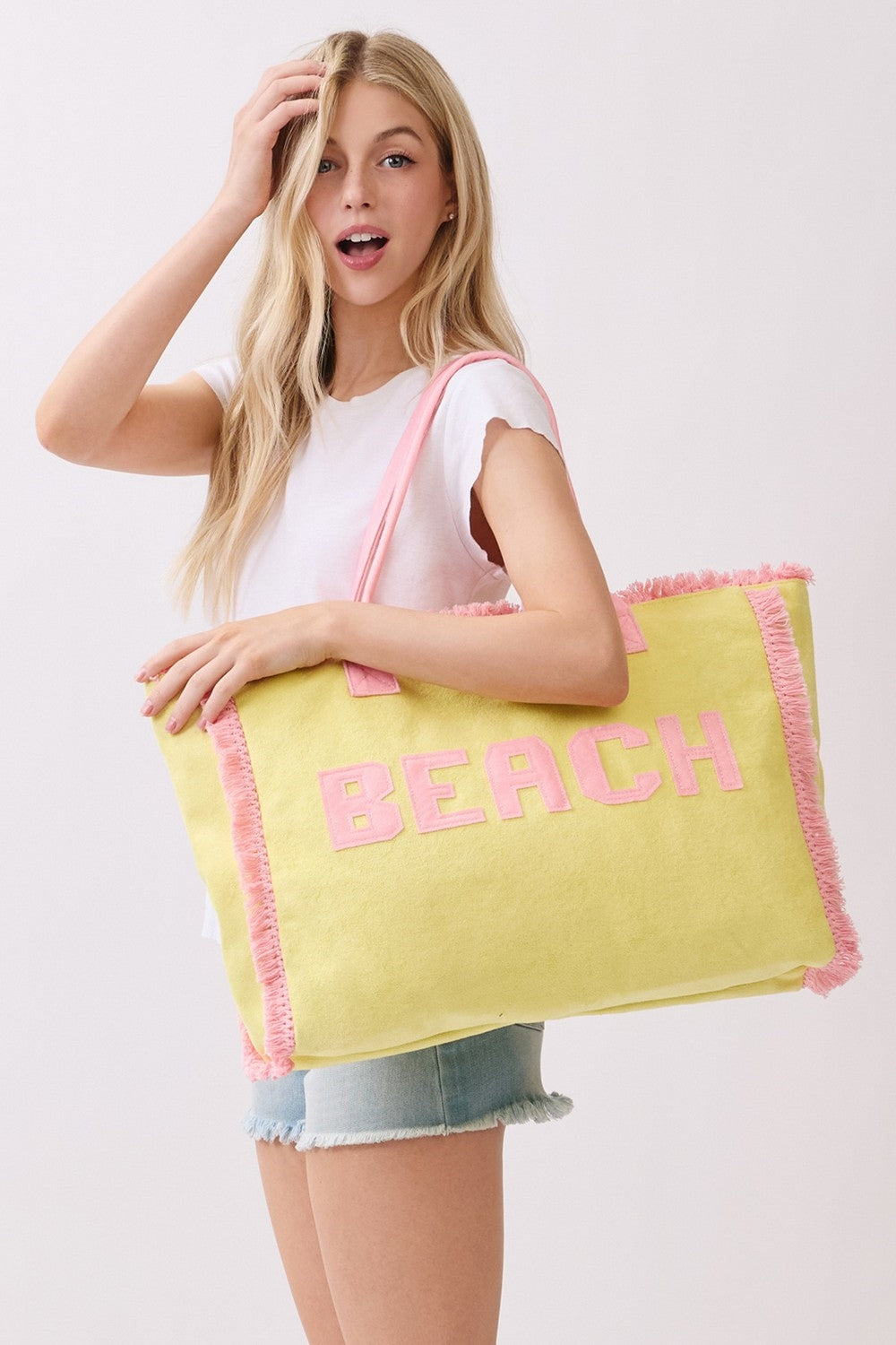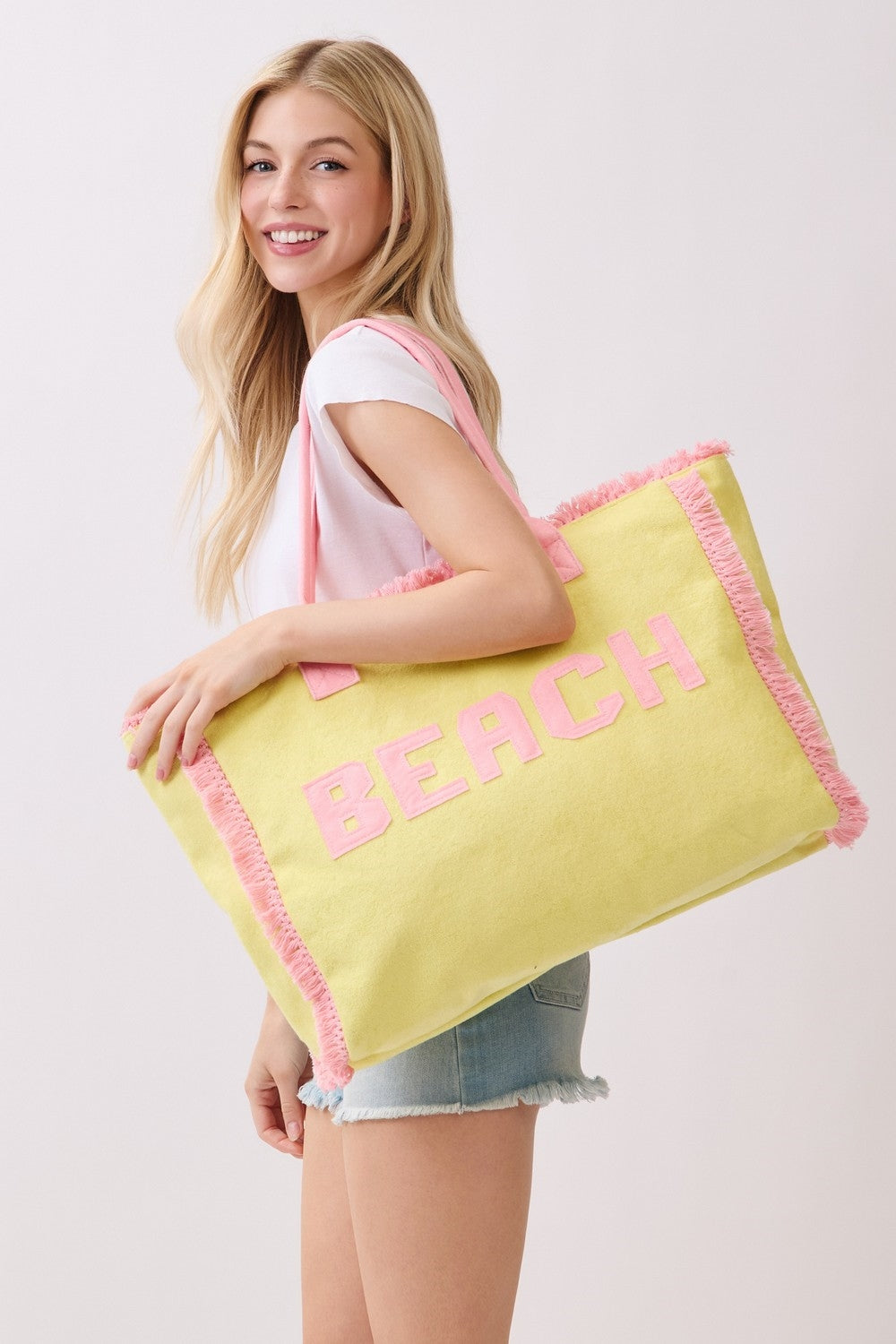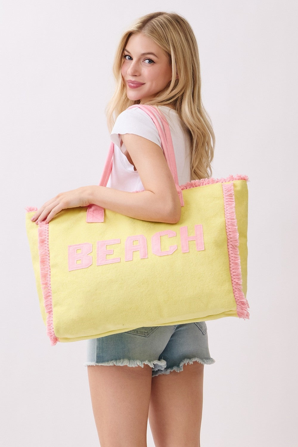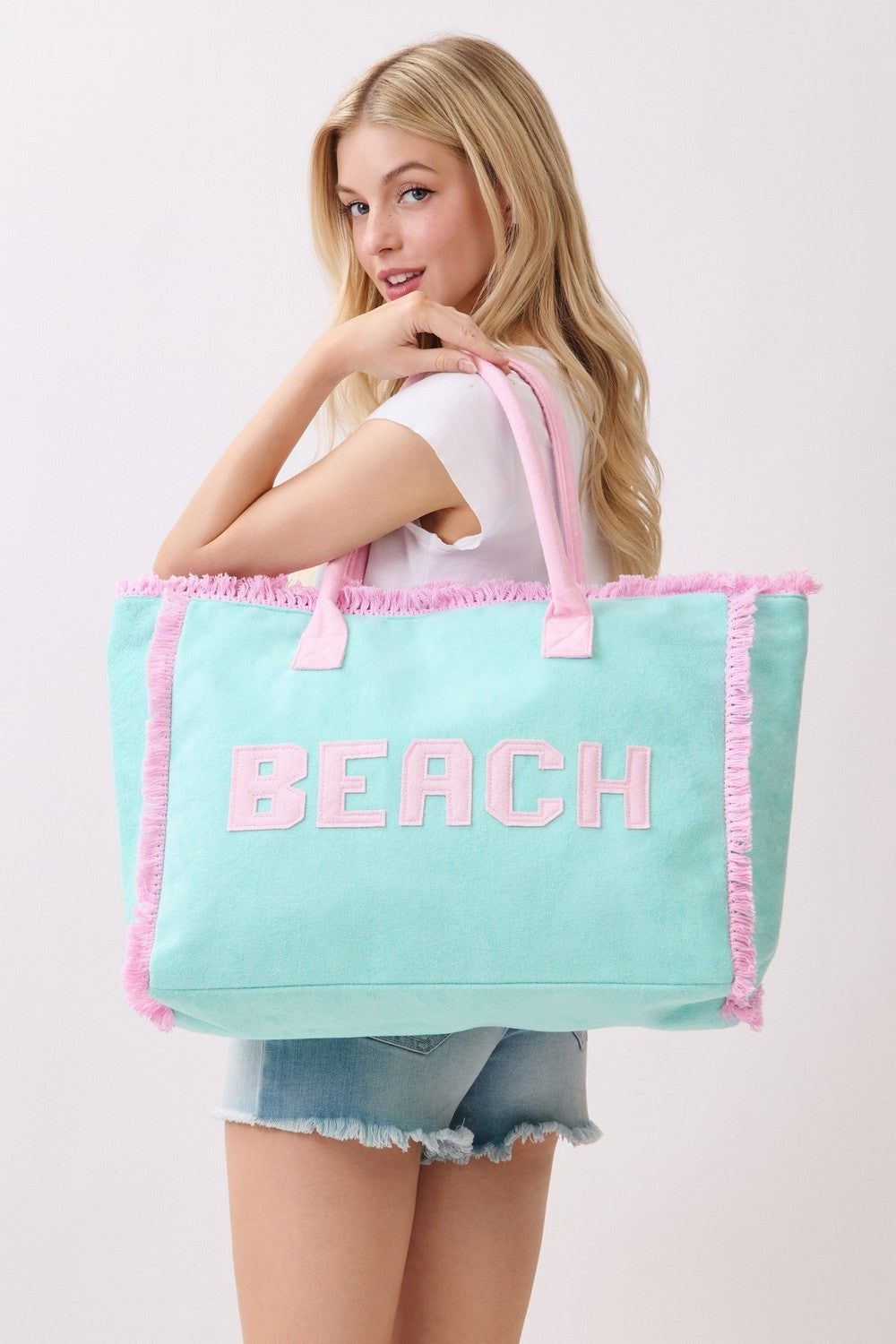 EMBROIDERED BEACH LETTER TERRY CLOTH FRAYED TOTE BAG  ZIPPER CLOSURE