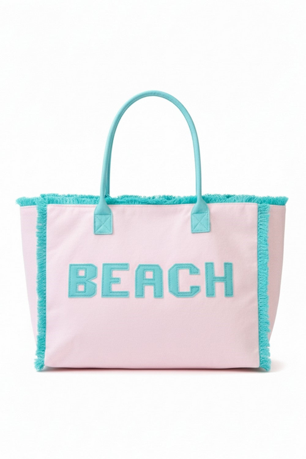 EMBROIDERED BEACH LETTER TERRY CLOTH FRAYED TOTE BAG ZIPPER CLOSURE