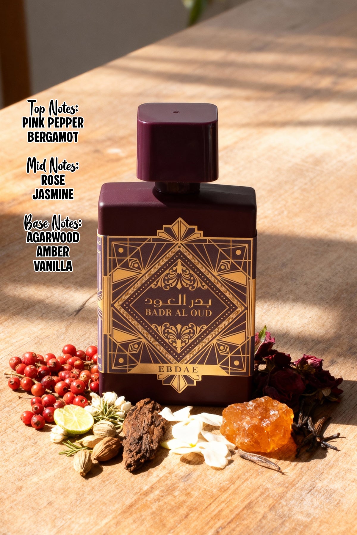 Base Notes: Agarwood (Oud), Amber and Vanilla.