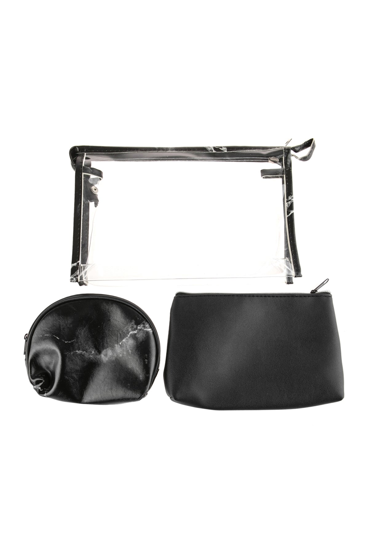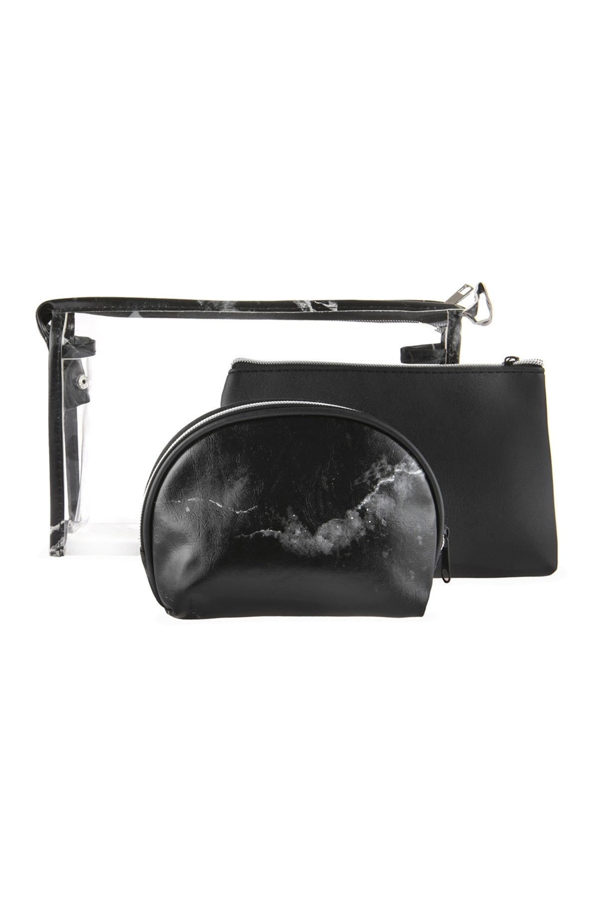 Material/s: Faux Leather Size: Clear Pouch: 11" Width, 7.5" Length, Medium Pouch: 8.5" Width x 6.5" Length , Small Pouch: 7" Width x